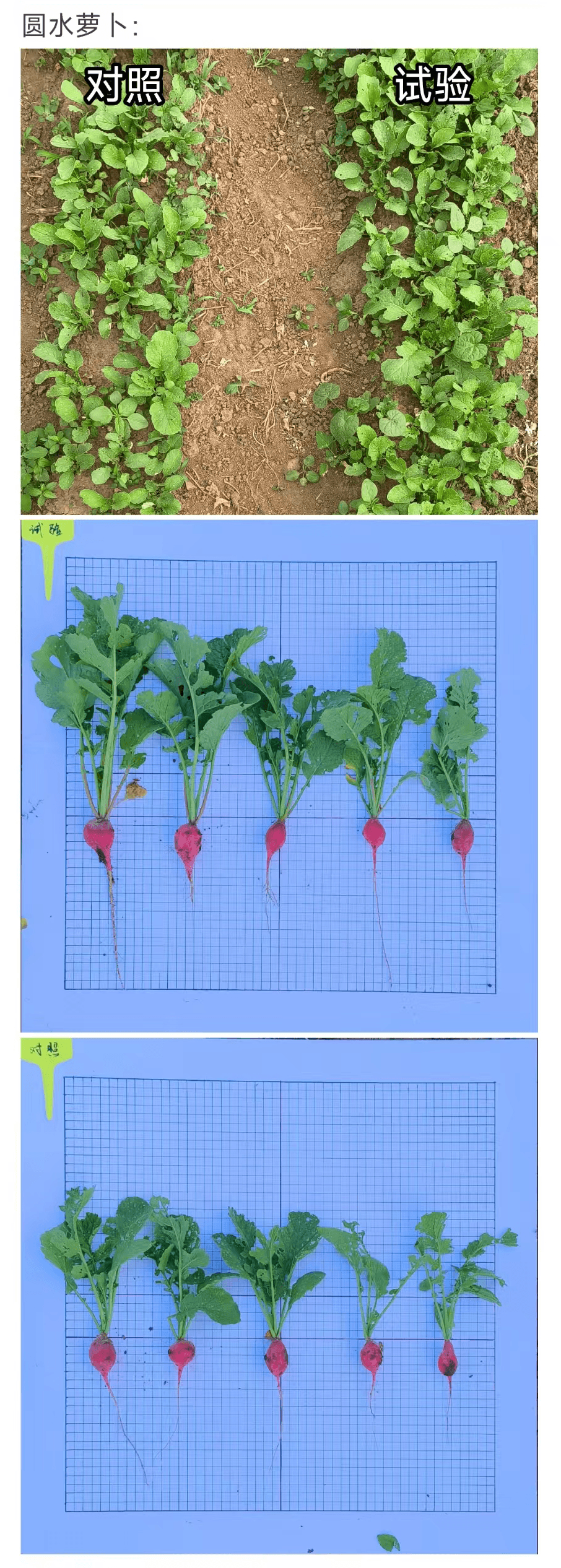 施用产品的水萝卜,根部膨大饱满,叶片茂盛,生长更壮实。