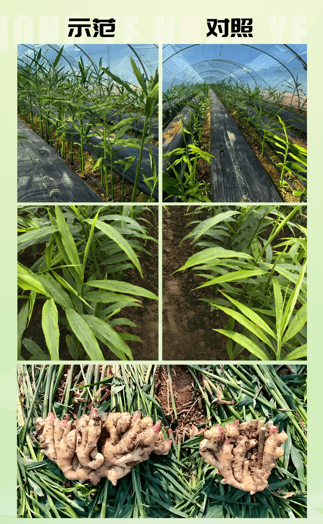 施用产品的姜,叶片肥厚有光泽,根茎分枝多、个头大,长势远胜对照组。