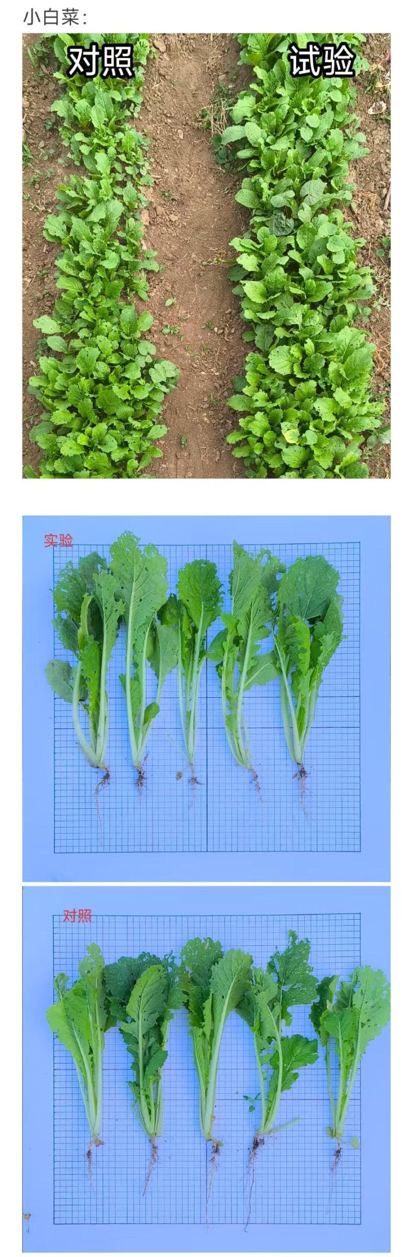 施用产品后的小白菜,叶片肥厚、数量多,整体长势整齐健壮,长势旺盛。