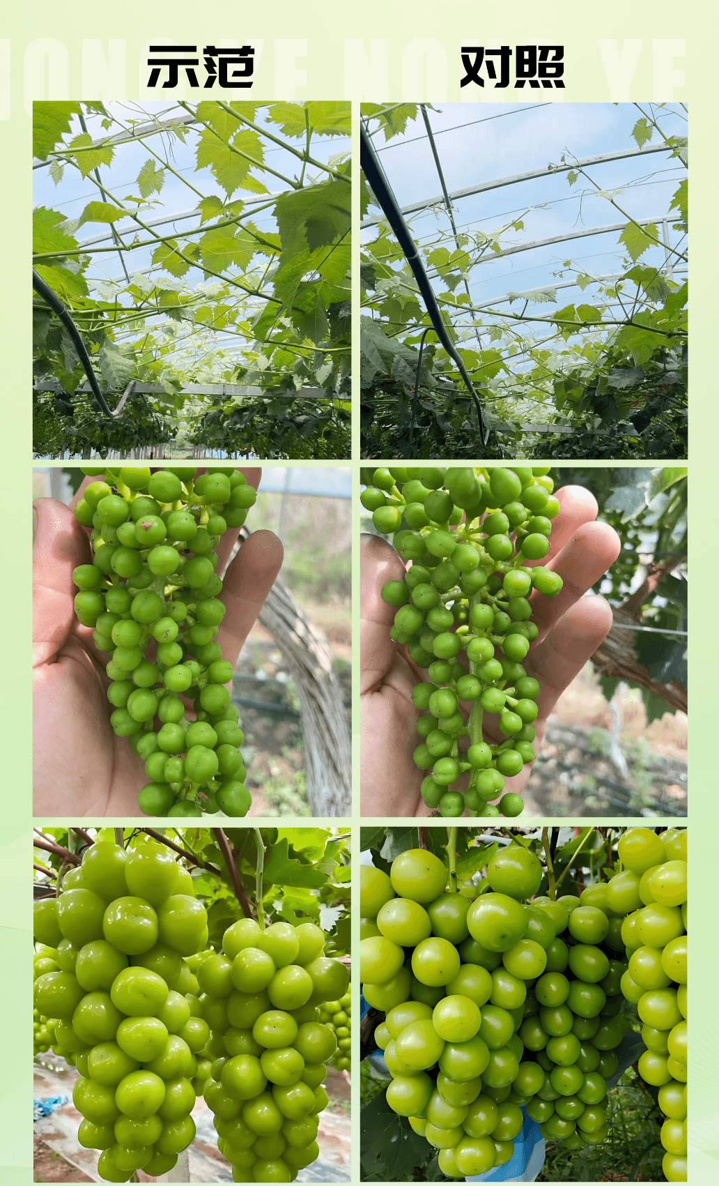 施用产品的葡萄,藤蔓更粗壮、叶片浓绿,挂果量多且果粒饱满,比对照组生长更旺盛。